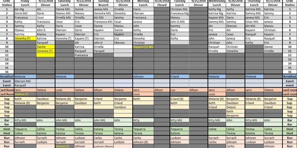 Each block indicates your time in and time out, which location you are scheduled in and also what type of event. For instance: if you are schedules for Special Event, you know to wear your vest uniform.
