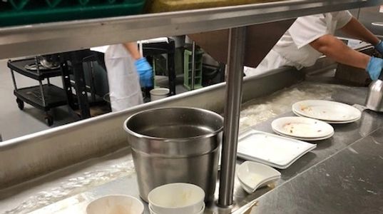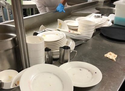 This is what you want the dish pit to look like, like sized plates stacked, silverware in the bin below and silver items put to the left. There is a dump bucket in the middle for liquids